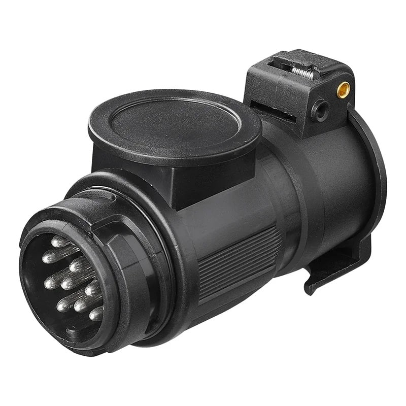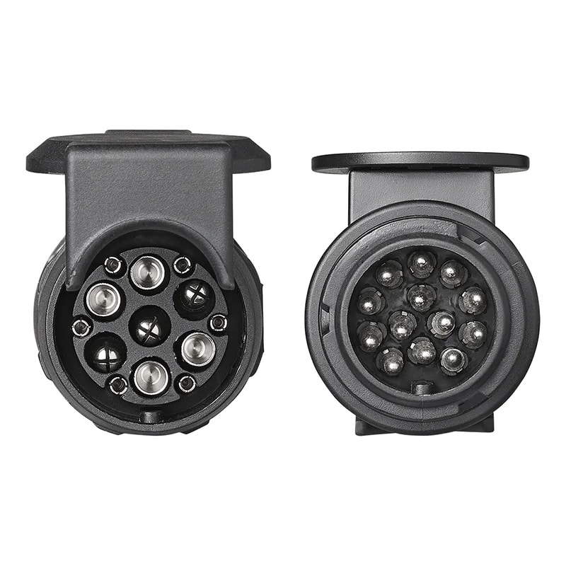 Verloopstekker van een 13 polig Jaeger stopkontakt aan de auto en een 13 polig Multicon WEST stekker aan de caravan.