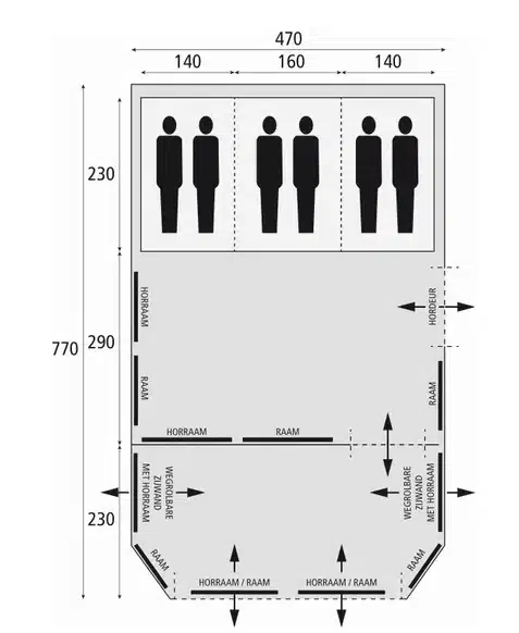 Deze luxe familietent beschikt over een royale leefruimte van 290 x 470 cm, die naadloos overloopt in een grote afsluitbare luifel van 230 x 470 cm. De indeling is volledig flexibel: de drie slaapcabines kunnen eenvoudig worden samengevoegd tot één gigantische slaapzaal van 230 x 440 cm.