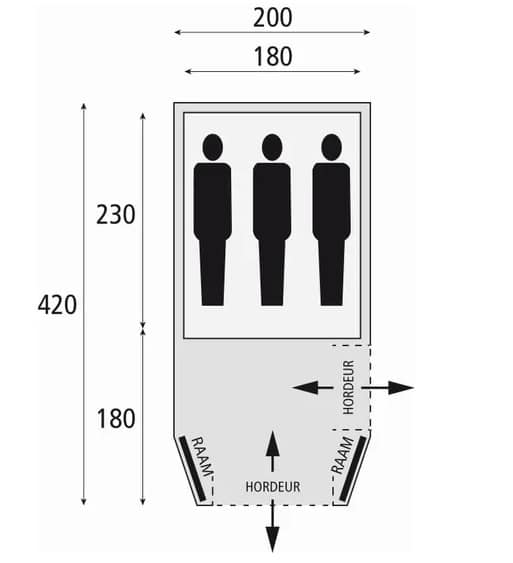 Ondanks het compacte formaat biedt de AirWolf verrassend veel ruimte. Met een totale lengte van 420 cm heb je een ruime slaapcabine (230 x 180 cm) én een praktische leefruimte voor je bagage. De tent is rondom voorzien van horrengaas (voorzijde, zijkant en achterzijde), waardoor je maximaal kunt ventileren zonder dat insecten naar binnen glippen.