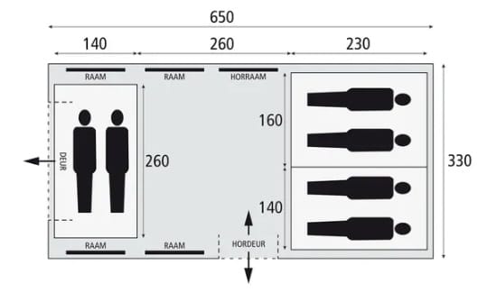 Slimme Indeling en Ventilatie De Porto Grande 650 blinkt uit in gebruiksgemak. De tent heeft zowel een voor- als zij-ingang (beide voorzien van horrengaas) voor een optimale doorluchting. Het Permanent Air Vent systeem en de Ground Air Control aan de achterzijde zorgen voor een constante, frisse luchtstroom. De extra donkere slaapcabines zorgen ervoor dat iedereen heerlijk kan uitslapen, zelfs als de zon al hoog aan de hemel staat.