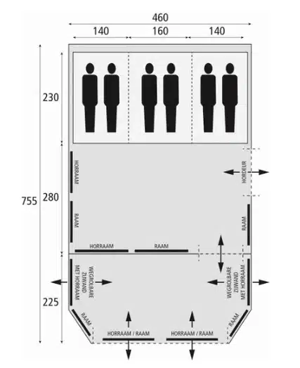 Met een enorme leefruimte van 260 x 400 cm en een diepe luifel van 225 x 460 cm biedt de Royal Prestige 400 een zee aan ruimte. De rechte wanden zorgen voor een optimale stahoogte van maximaal 225 cm, waardoor u gemakkelijk een volledige kampeerset met tafel, stoelen en kooktoestel kunt plaatsen.