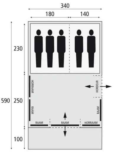 Slimme Indeling De Spitfire 340 XL beschikt over een ruime leefruimte met een comfortabele stahoogte van 210 cm. De voorwand is volledig weg te ritsen, waardoor je de luifel direct bij de leefruimte betrekt. De slaapcabines zijn extra donker uitgevoerd, zodat je ook tijdens de lichte zomernachten geniet van een onverstoorde nachtrust.