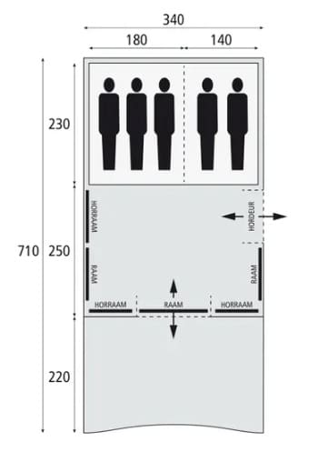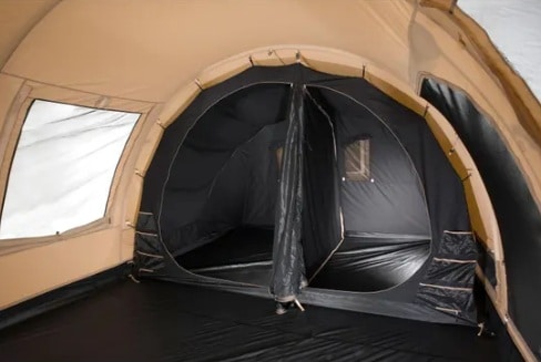 Rustgevend Slapen Achterin de tent bevinden zich twee extra donkere slaapcabines (230 cm lang). Deze zijn gescheiden door een wegritsbare wand, zodat je kunt kiezen voor twee aparte kamers of één grote master-bedroom. De donkere stof van de binnentent zorgt ervoor dat je niet gewekt wordt door het vroege ochtendlicht.