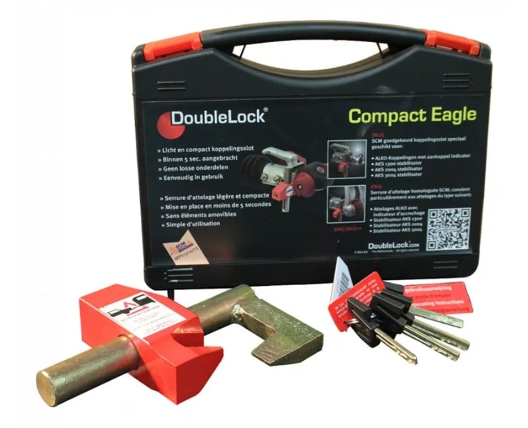 Het Eagle koppelingsslot van DoubleLock is lichtgewicht en compact. Doordat het geen losse onderdelen bevat is het makkelijk te bevestigen. Het koppelingsslot wordt geleverd in een handige koffer met vijf sleutels. Dit koppelingsslot is SCM goedgekeurd. De Eagle is geschikt voor alle Al-Ko kogelkoppelingen met de rode aankoppelindicator en de AKS 1300, 2004 en 3004 stabilisatorkoppelingen.