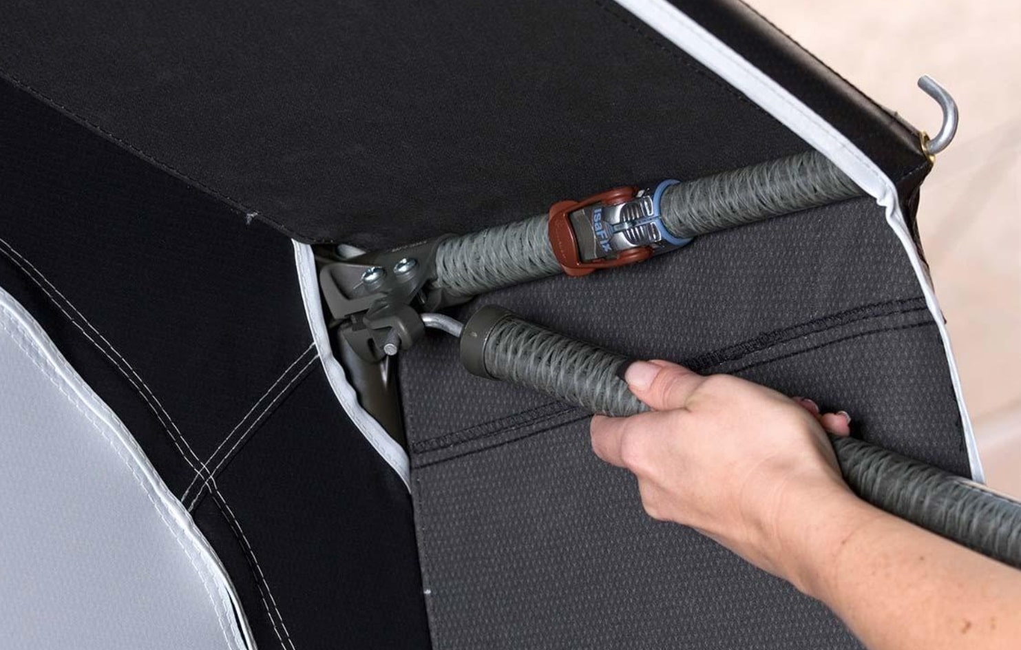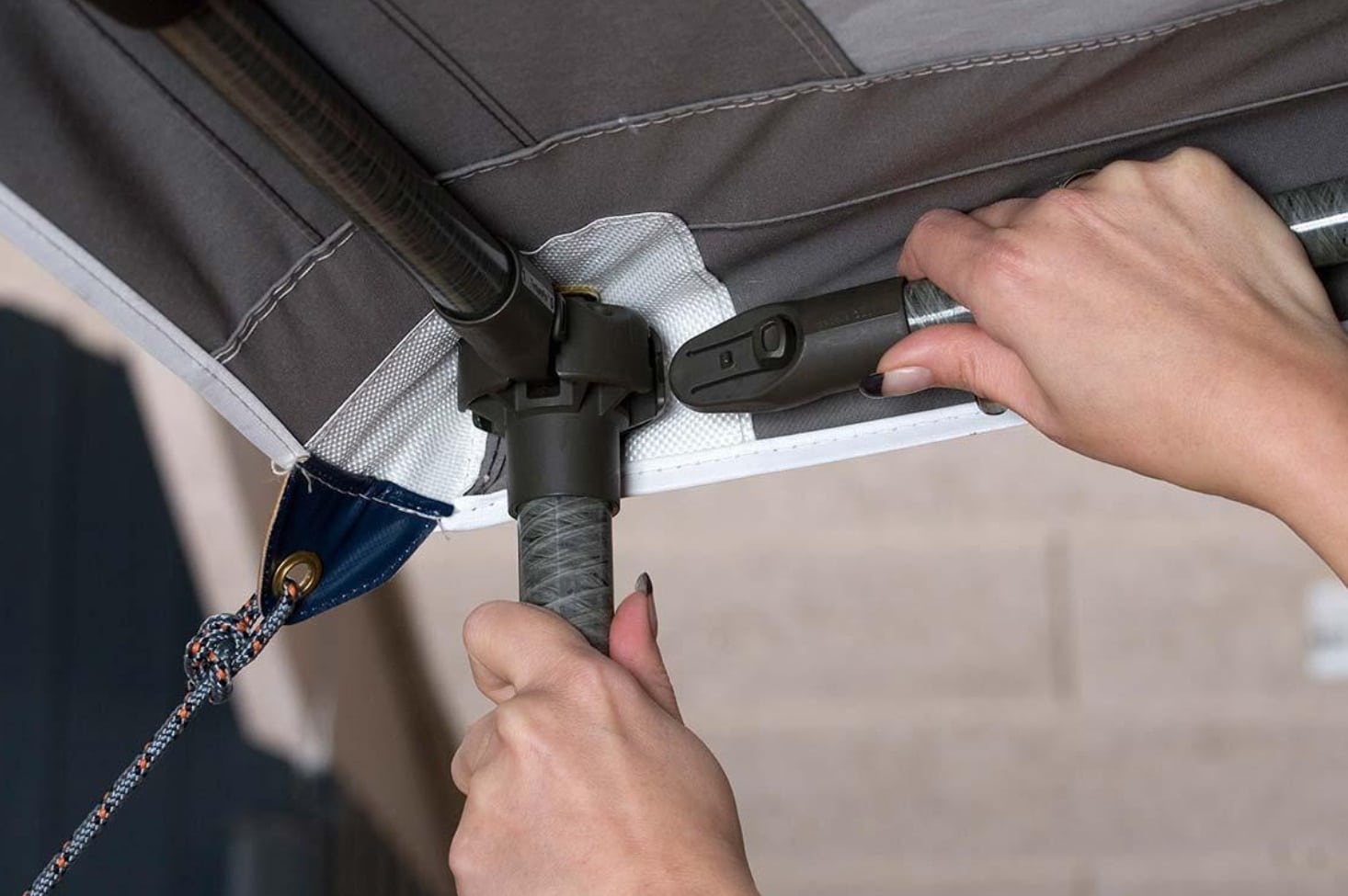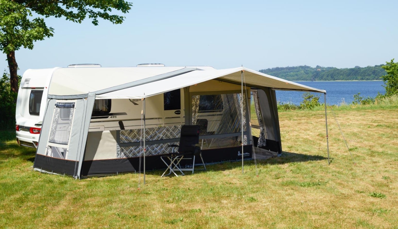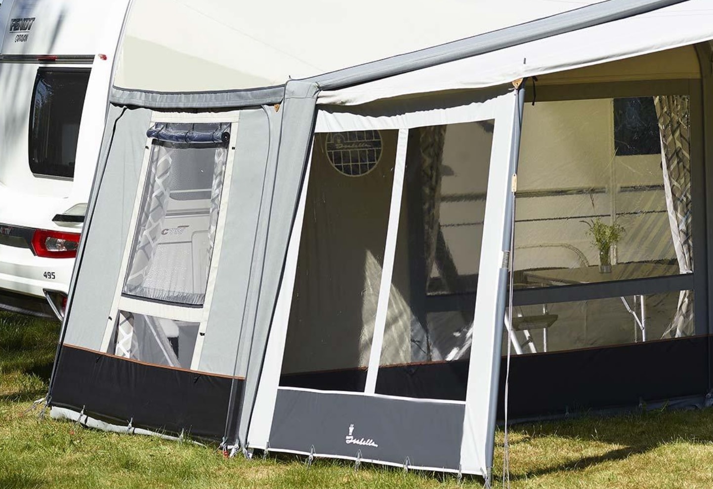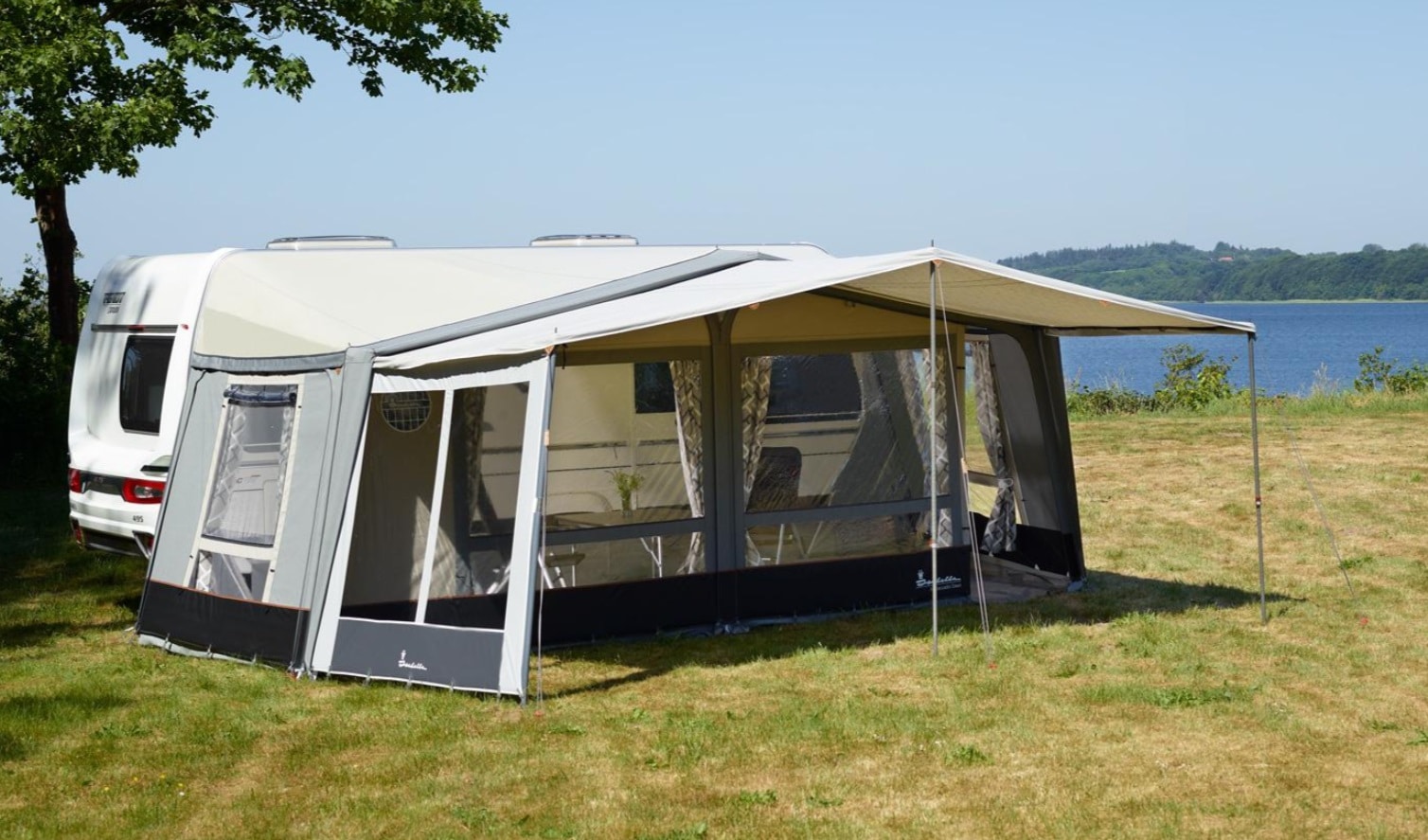Optioneel verkrijgbaar: Wil je extra beschutting en afscherming, dan kun je optioneel een zijwand (261000311) aanschaffen voor het Eclipse zonneluifel. De zijwand heeft twee grote ramen en kan aan de linker- of rechterzijde worden gemonteerd. Gebruik je de zijwand en het Eclipse zonneluifel direct op de caravan (zonder voortent), dan is een Eclipse Adaptor (261000416) vereist. Dit is een klein zijstuk dat boven de zijwand wordt geplaatst en zorgt voor een goede afsluiting tussen de zonneluifel en de caravan.