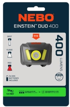 Nebo Einstein Duo 400 een compacte en krachtige hoofdlamp. De Duo 400 is dé ideale hoofdlamp voor avonturiers die betrouwbaarheid en veelzijdigheid zoeken. Deze compacte lamp werkt zowel op de meegeleverde AAA-batterijen als op oplaadbare LI-ION batterijen, zodat je altijd voorzien bent van licht. De lamp beschikt over drie verschillende LED-modi:
