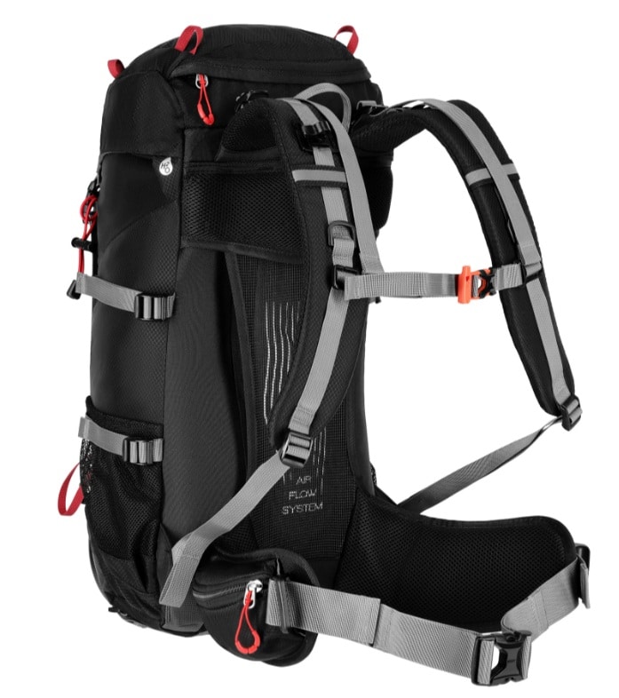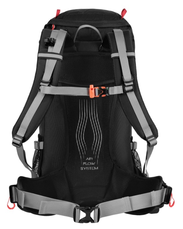 Een geïntegreerd noodfluitje is op de gesp van de borstband geplaatst, wat de veiligheid van de gebruiker verhoogt. Een extra paneel met handgrepen biedt de mogelijkheid om bijvoorbeeld wandelstokken of andere accessoires te bevestigen. De rugzak heeft ook twee zijvakken van mesh en een vak met ritssluiting op de heupband, ideaal voor een telefoon of andere kleine spullen.