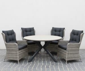 De SIlvia diningstoel heeft een aluminium frame en kunststof wicker bekleding. De extra dikke kussens zorgen voor een heerlijk zitcomfort. De Edison tafel heeft een aluminium onderstel met een Vironwood blad dat onderhoudsvrij is.