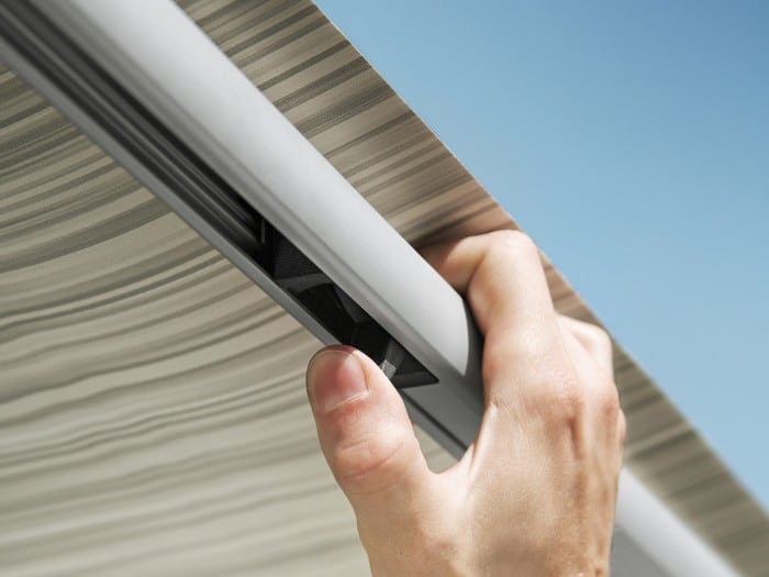 De luifel wordt gemonteerd door de pees het in de aanwezige caravanrail te schuiven. Boren is niet nodig.
