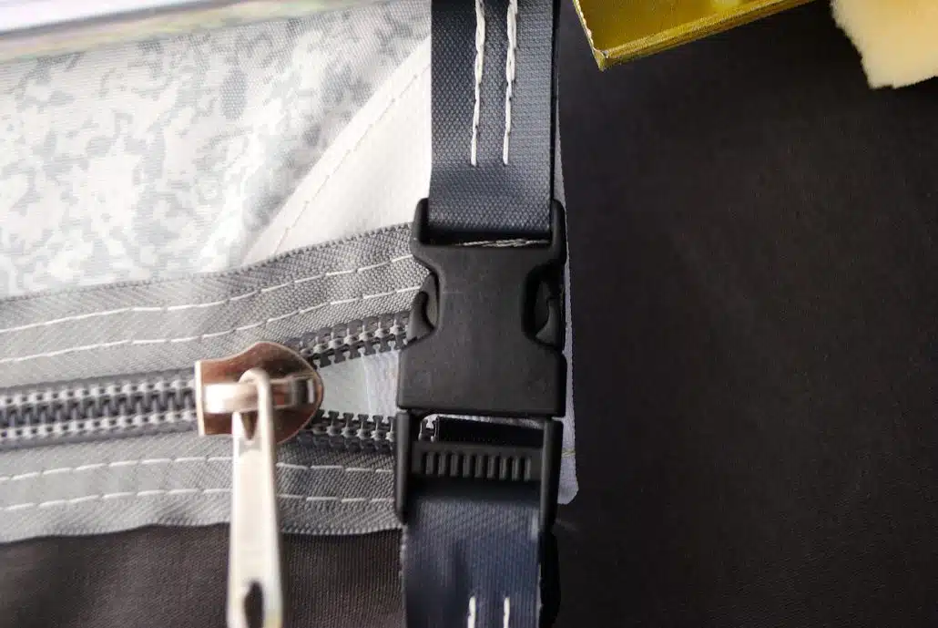 Alle tunnels waar de stokken doorheen gaan zijn voorzien van ritsen. Zo kan het dakgedeelte van de luifel, na uitritsen van de zijwanden, opgerold worden bij zeer slecht weer, terwijl het frame gewoon blijft staan.